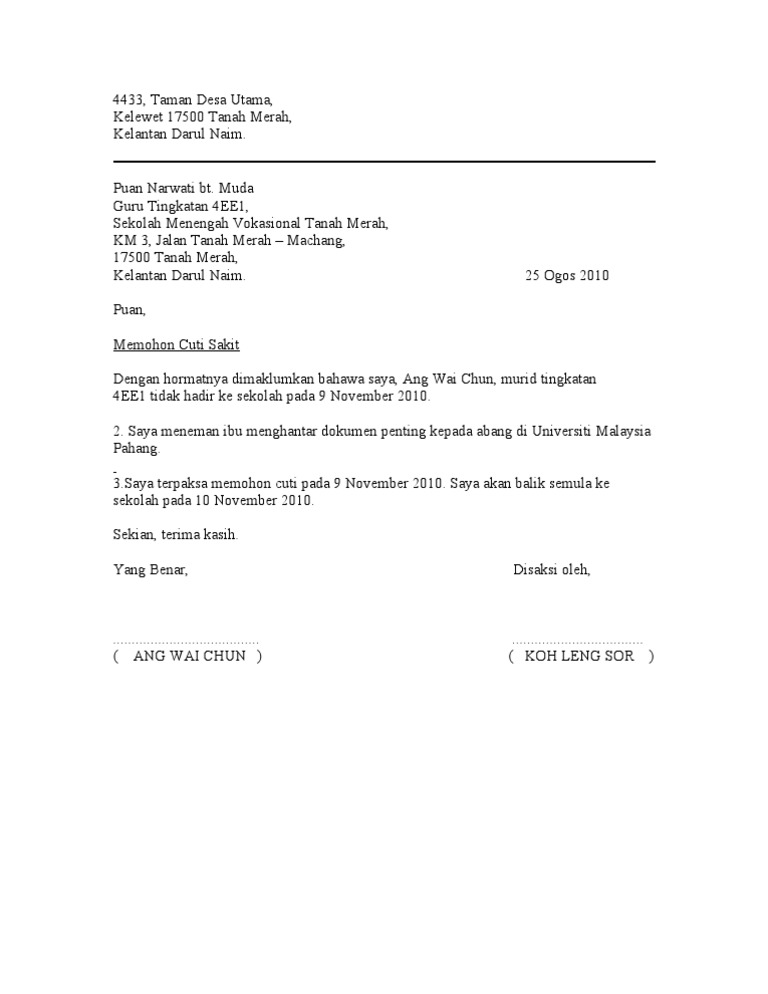 Oct 14, 2018 · contoh surat permohonan cuti barah has become the image we ascertained on the internet from reliable creativity. 2 surat perkeliling cuti sakit kementerian 1009 Contoh surat rasmi tidak hadir ke sekolah kerana demam via contoho. Jul 21, 2021 · untuk makluman, bpsm kpm telah mengedarkan surat pemakluman kepada semua bahagian/ jabatan pendidikan negeri berhubung format surat iringan dan senarai semak bagi permohonan cuti sakit, cuti sakit lanjutan, cuti kecederaan, cuti tanpa rekod, cuti separuh gaji, cuti tibi kusta barah dan permohonan kebenaran berubat di yayasan bukan kerajaan di peringkat kuasa tertentu. Bagi pegawai yang telah melahirkan anak selepas minggu mengandung 22. Contoh surat permohonan cuti sakit barah. Bagi mendapatkan tempoh rawatan yang panjang. Cd a d a d cd d a o d d d o o cd c 3 0 d co o d d d c m m z cd o. Contoh surat permohonan izin tidak masuk kerja wisata via minangrancak.com. We make up one brain to discourse this contoh surat permohonan cuti barah picture upon this webpage because predicated on conception via yahoo image, its one of the most notable reted queries keyword on yahoo search engine. Jun 01, 2021 · borang permohonan cuti bersalin. Borang permohonan lain lain cuti sakit borang 2 2bc6 03a pada mukasurat 2 borang ini jika telah mengambil cuti sakit lebih daripada jumlah maksimum dalam setahun atau bagi lain lain cuti sakit. Contoh kew 8 cuti sakit barah butir butir perubahan tarikh gaji catatan no.